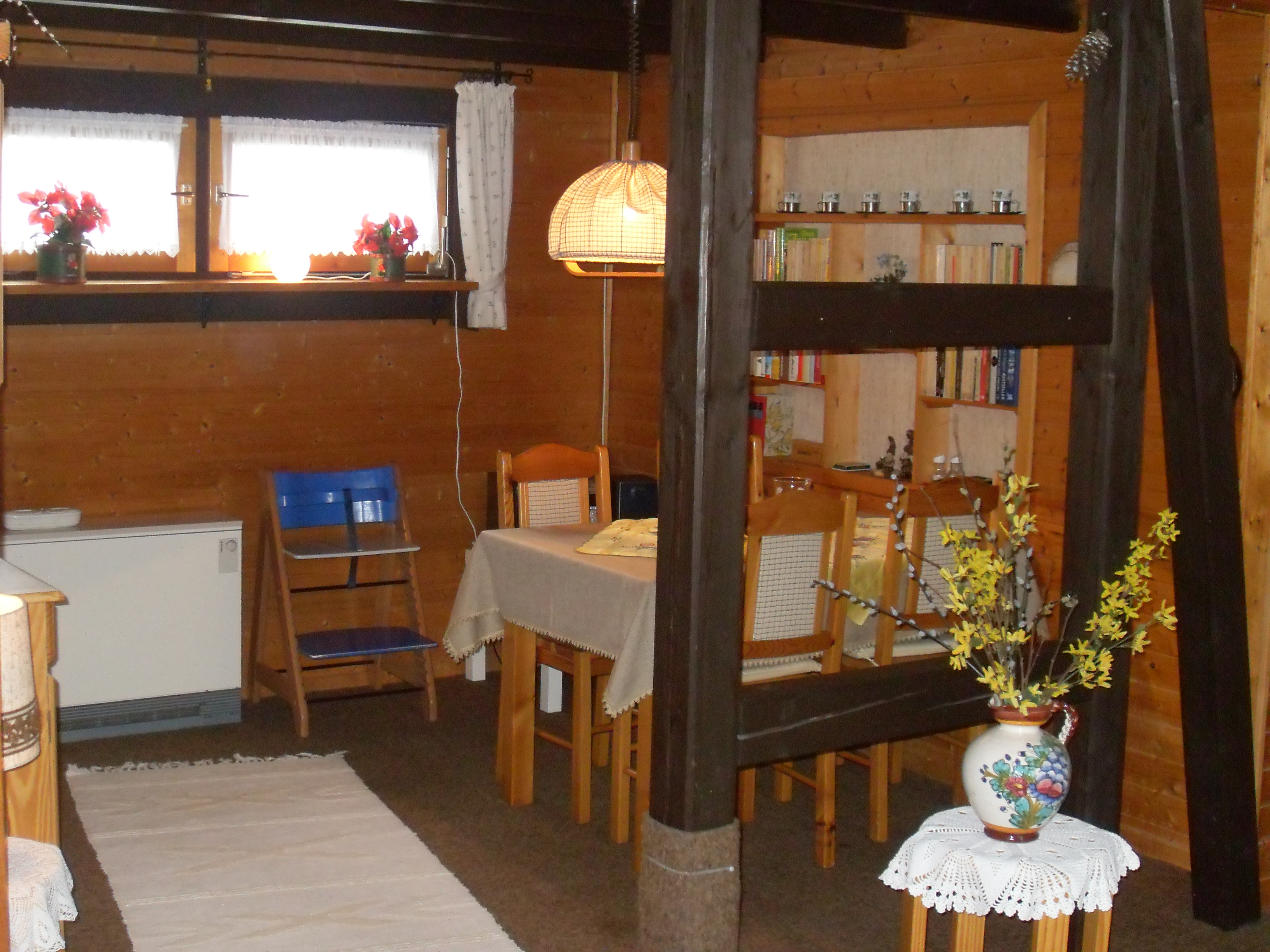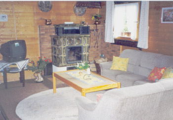 Im Wohnzimmer lädt die Sitzecke am Kachelofen zum